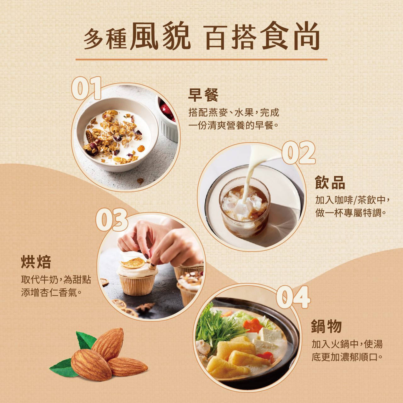 杏仁原果研磨,沉澱屬正常現象,飲用前請搖勻,冷藏後飲用風味更佳。